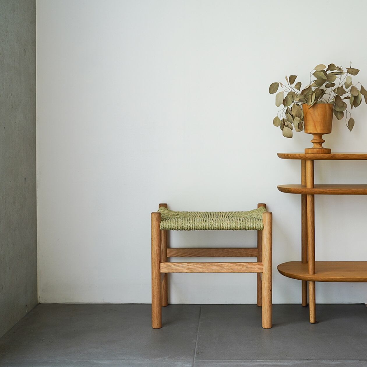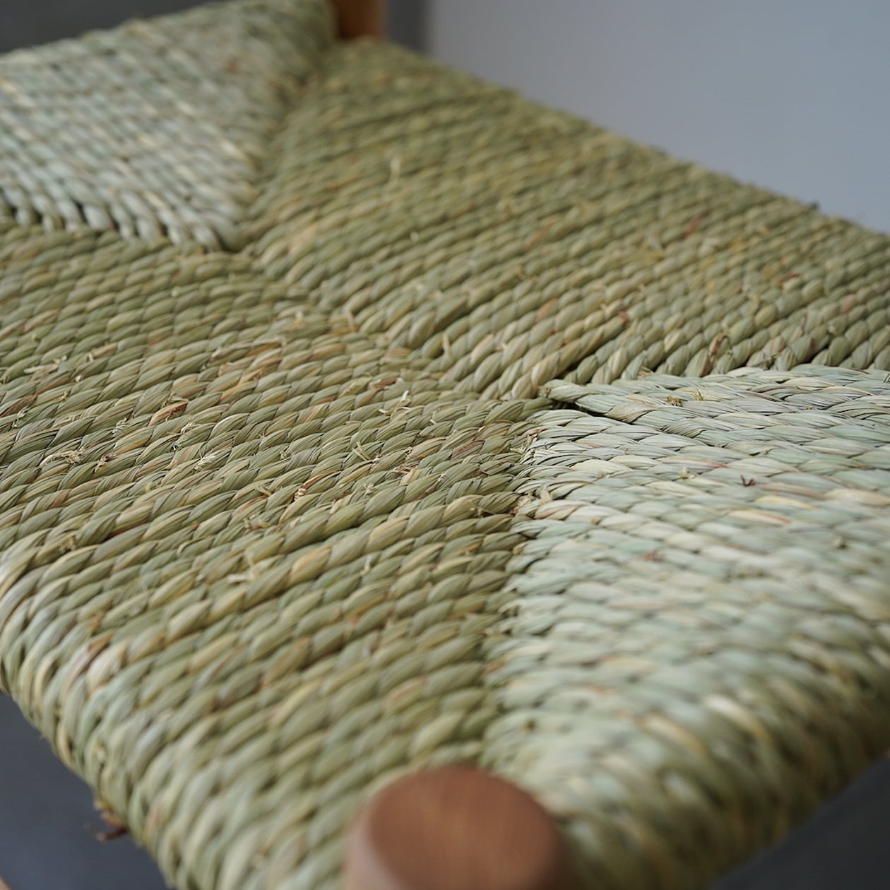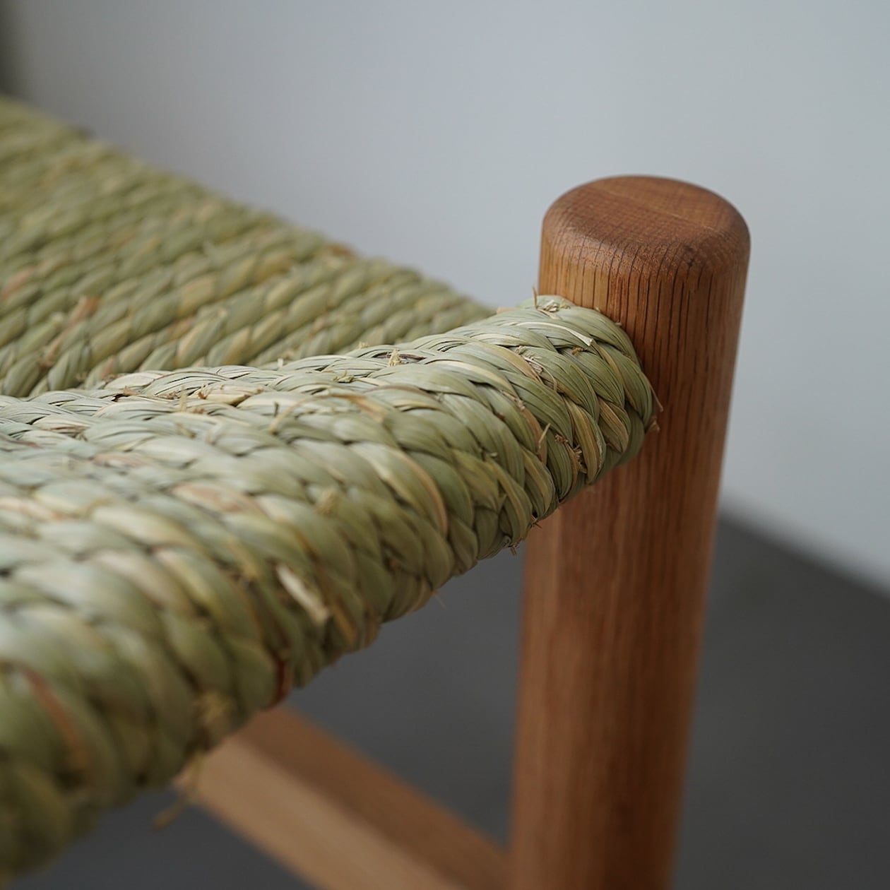 フレームには蜜蝋クリーム塗装を施したオーク材を用い、座面は職人が国産イグサを用いて丁寧に編み上げました。編みたてにはい草の、なんとも落ち着く良い香りが楽しめます。
