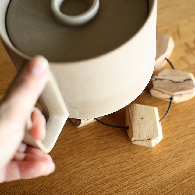 つの虫喰い材のブロックからなる、虫喰いの鍋敷きです。ブロックを小さくまとめれば、小さな鍋敷きになり、ブロックの間隔を広くすれば、大きな鍋敷きとして使う事が出来ます。革紐でつながれているので、普段は壁にかけたりして、虫喰いの模様を楽しむ事が出来ます。
